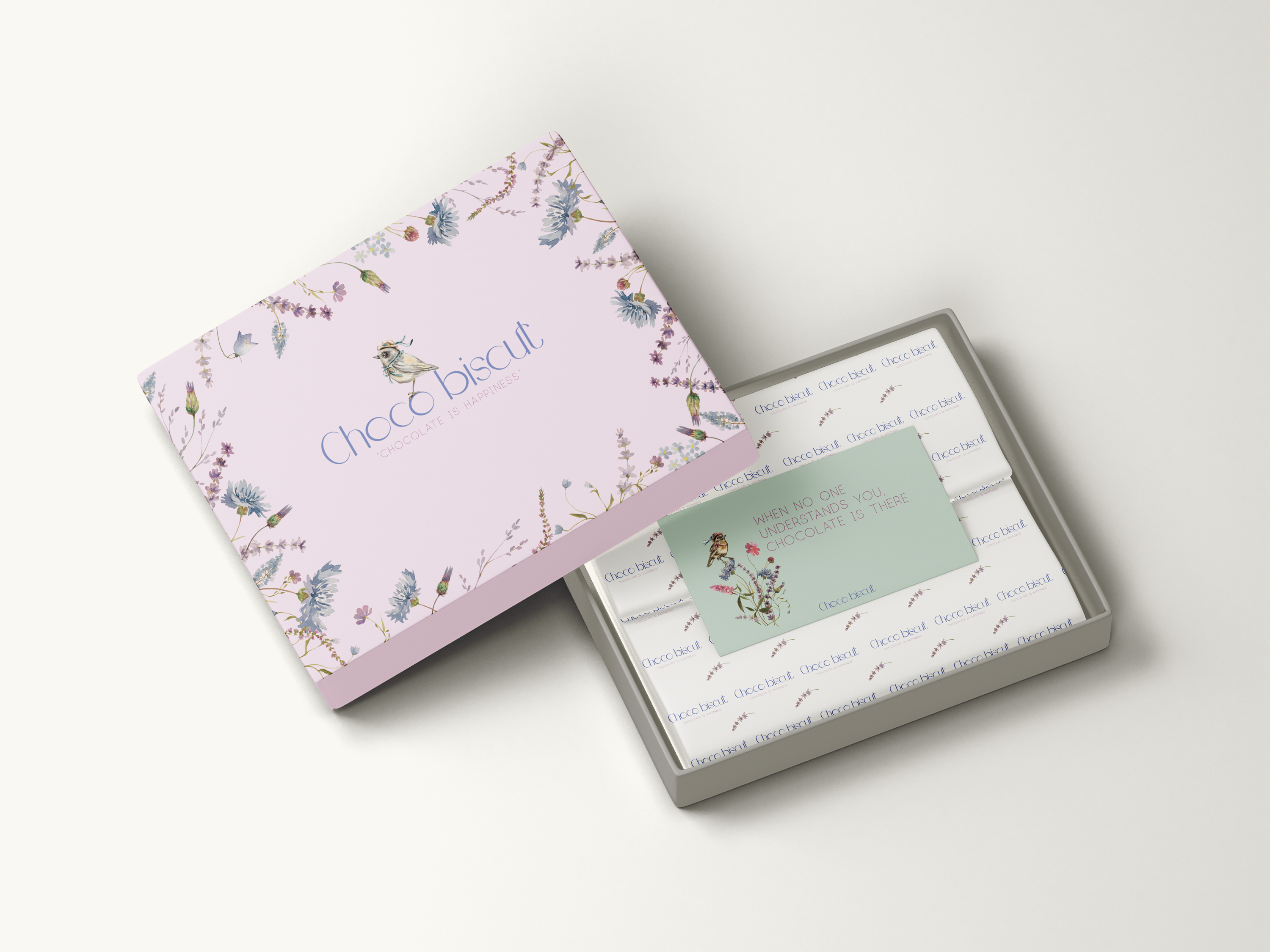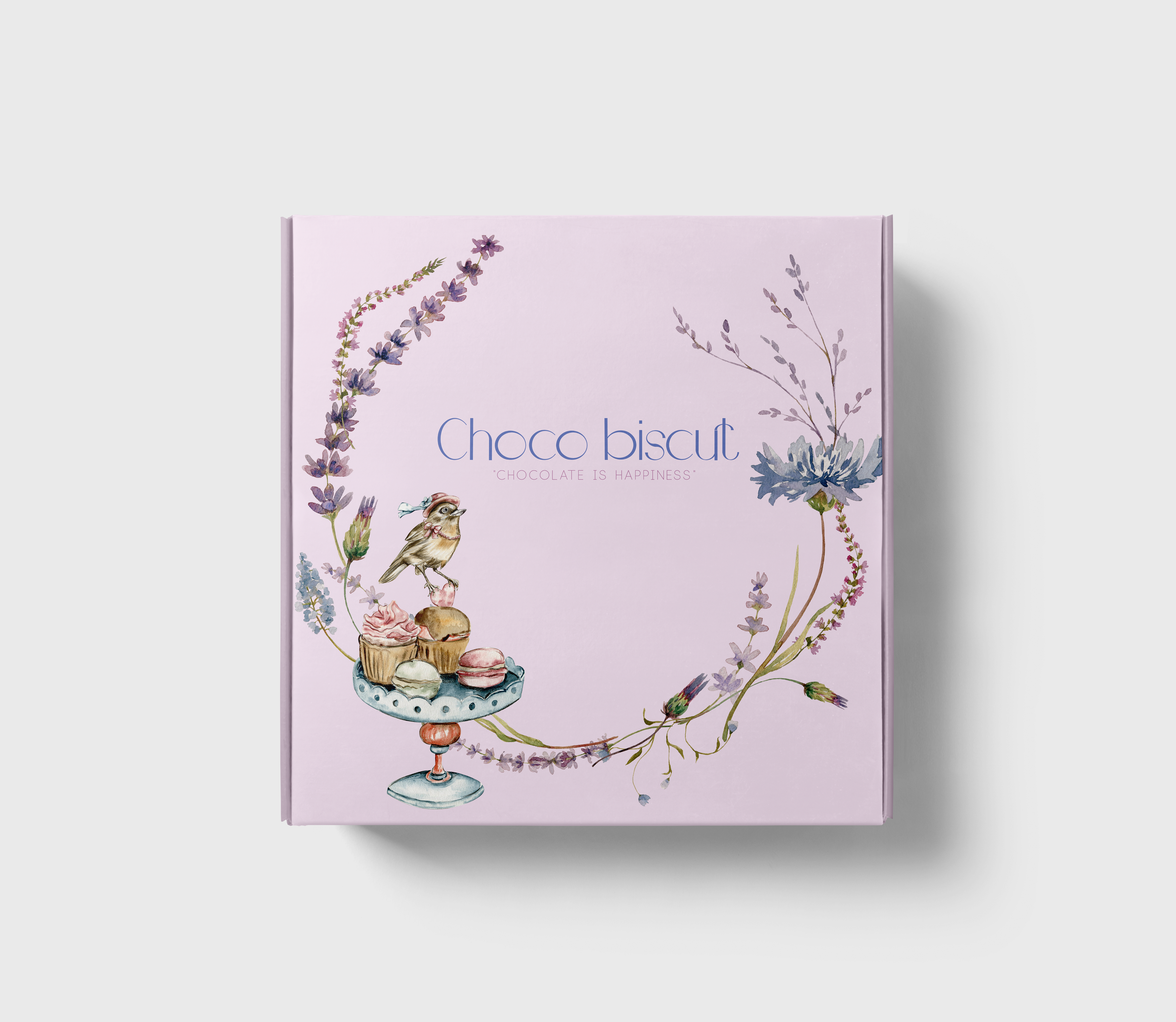 A light purple rose was chosen as the main color, with design touches inspired by the classic antique style of luxury chocolate packaging from previous eras.