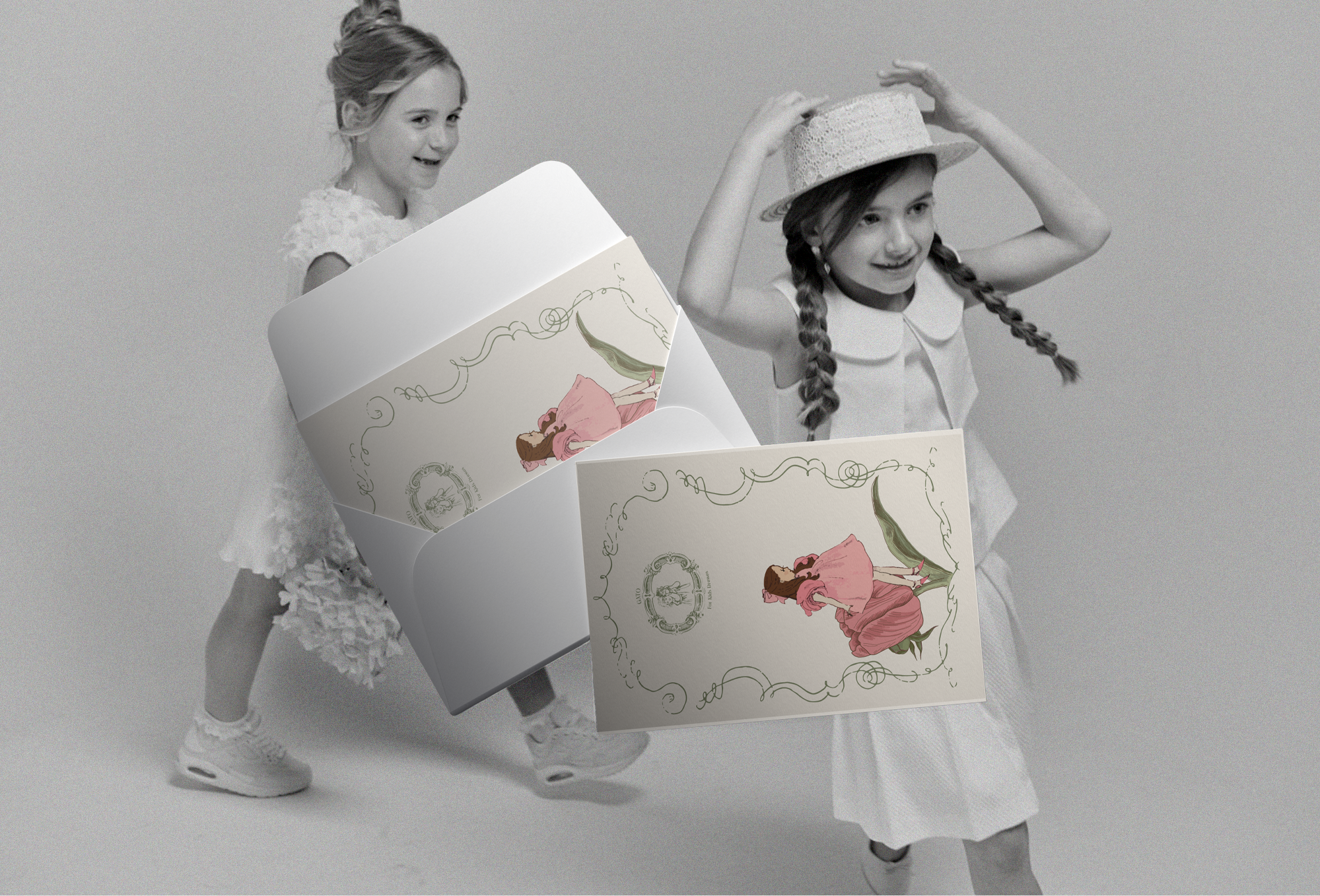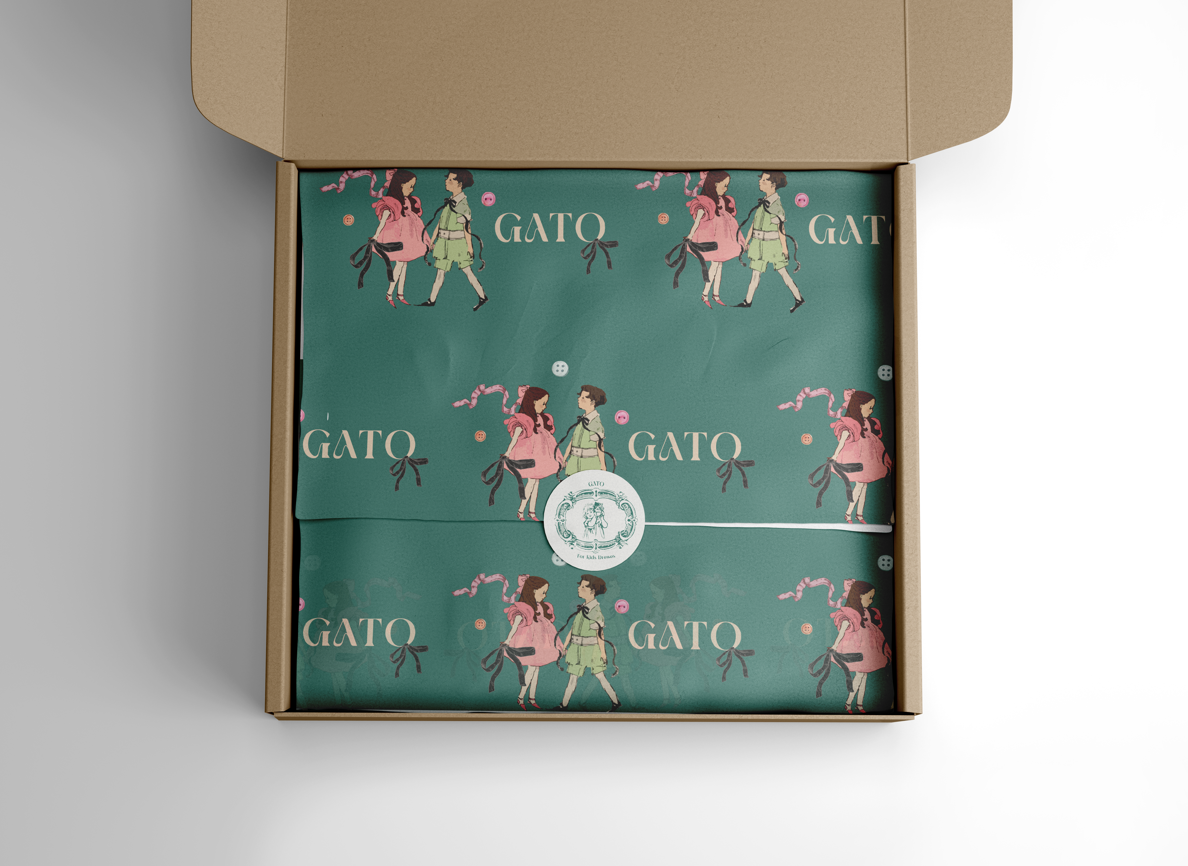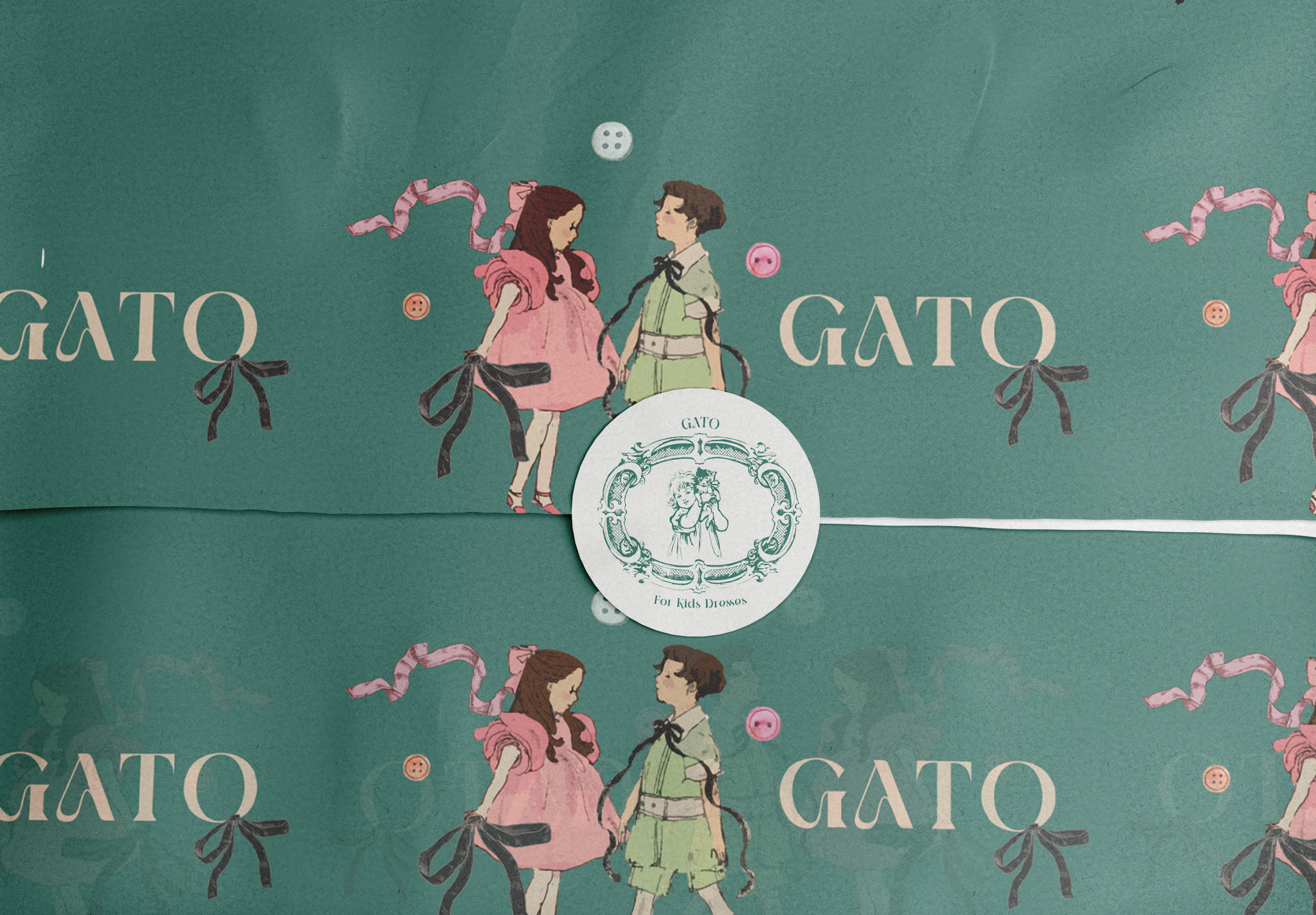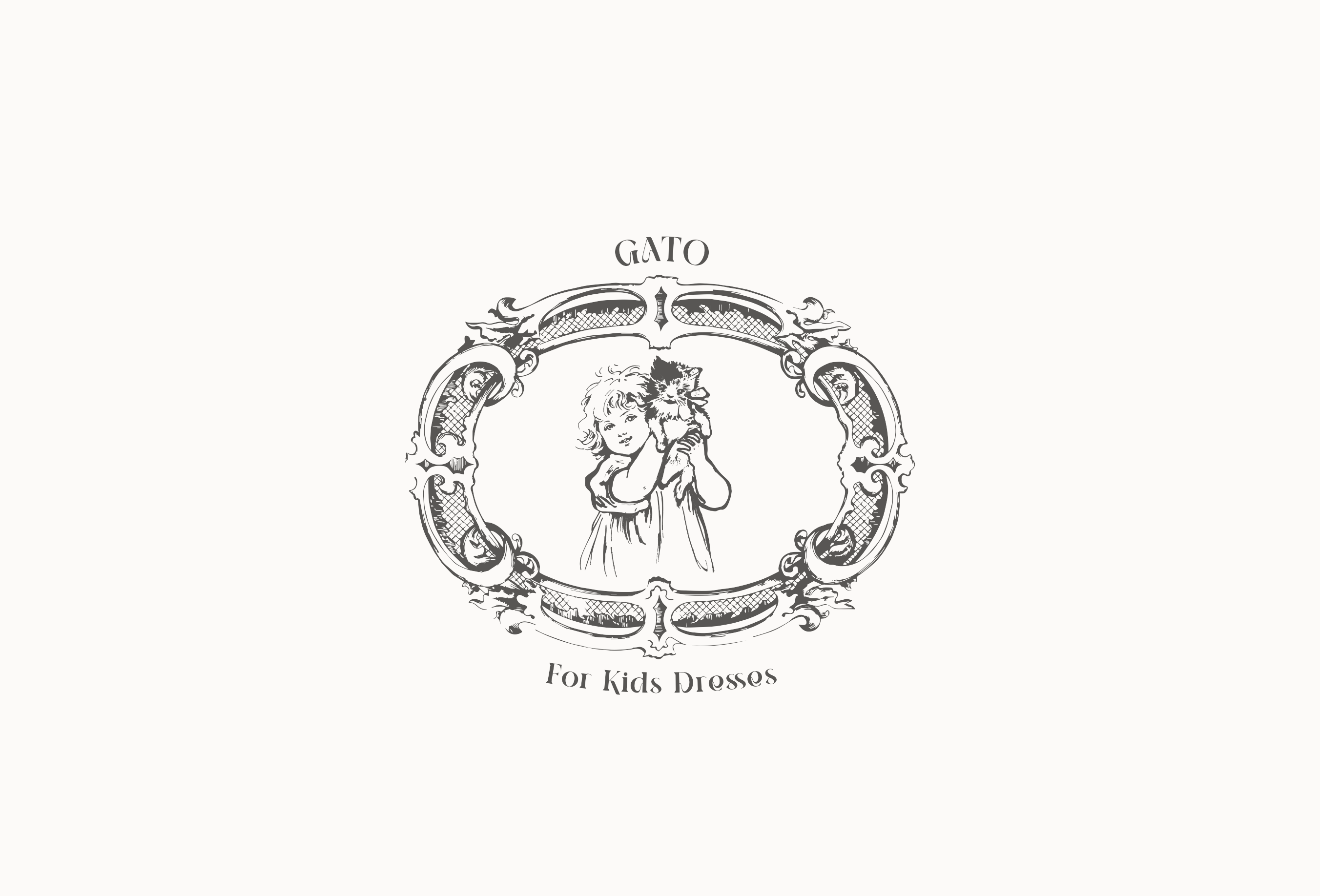 The identity of “Gato” was designed with a classic logo like a stamp, The identity is based on soft Victorian lines, with simple decorations inspired by lace and the frame of old stamps. The brand is for children’s clothing with a classic French style
