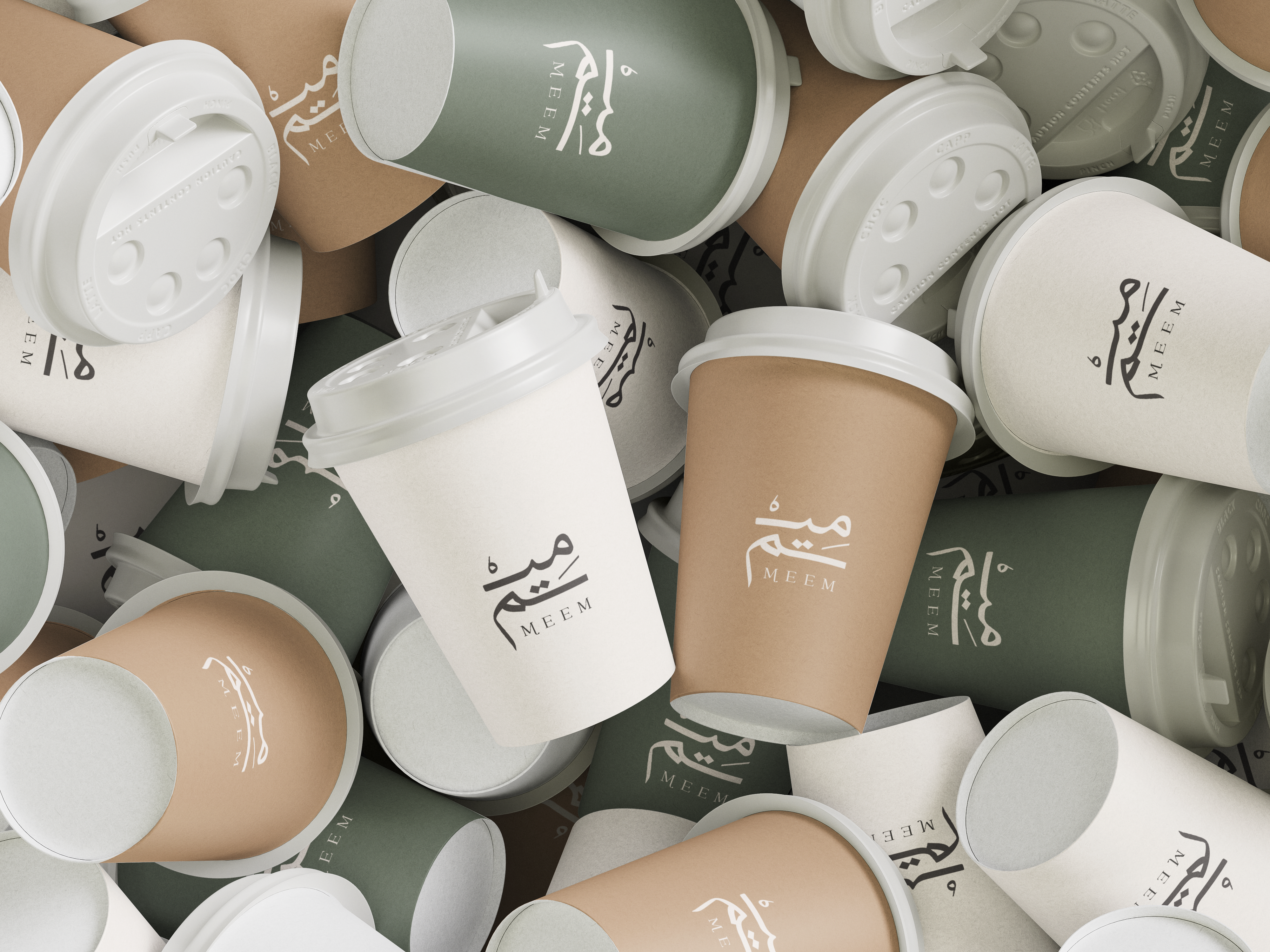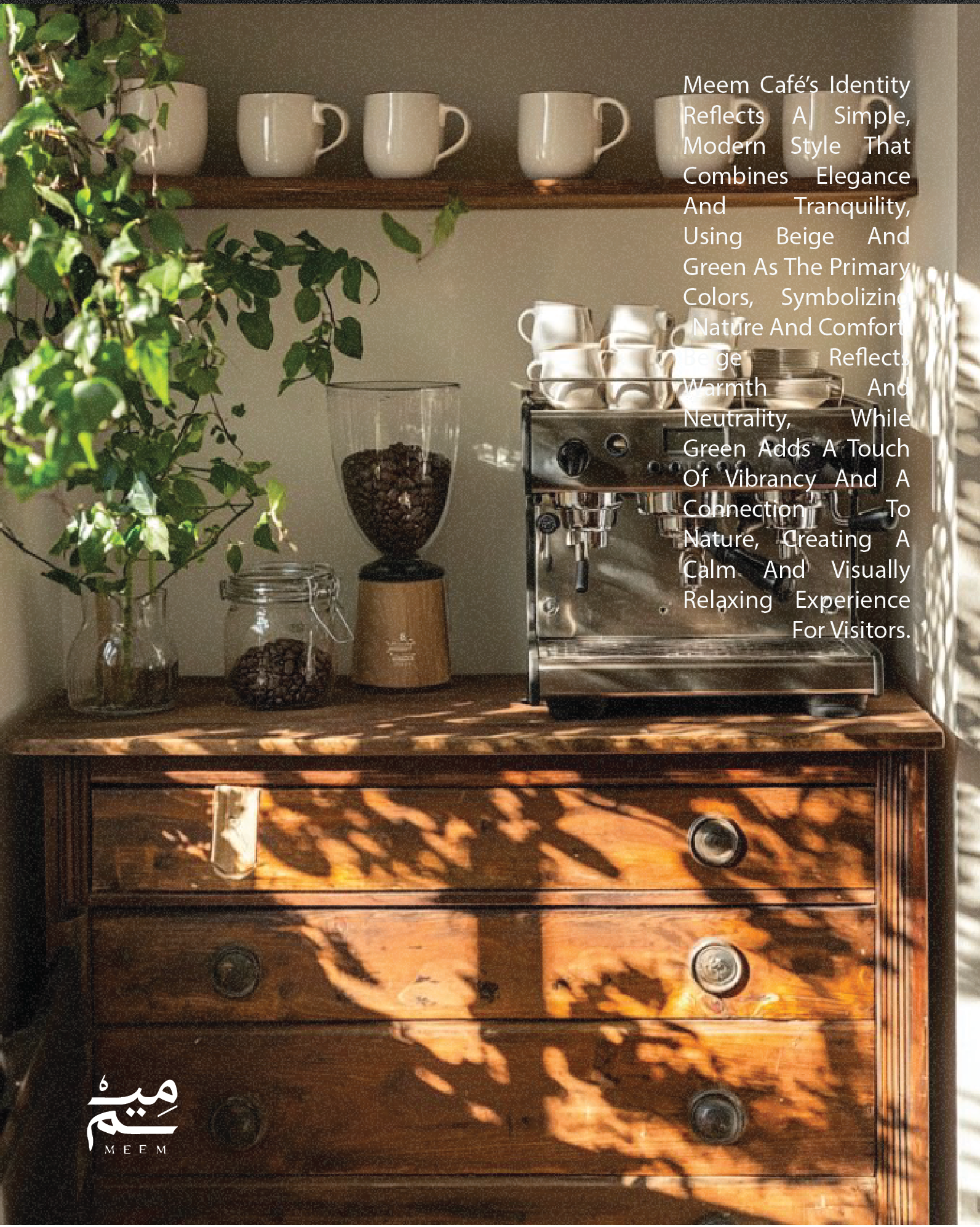 Meem Café’s identity reflects a simple, modern style that combines elegance and tranquility, using beige and green as the primary colors, symbolizing nature and comfort.